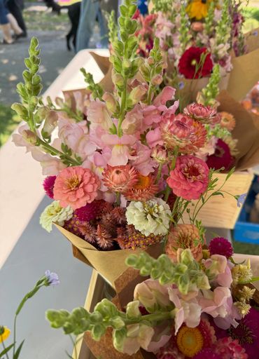 Depuis le début du projet de jardin, nous avons toujours inclus des fleurs annuelles aux travers des cultures, pour attirer les pollinisateurs, et parce qu'on aime leur beauté. La saison 2024 nous a permis d'expérimenter la culture de fleurs coupées, destinées à la confection de bouquets fermiers.
